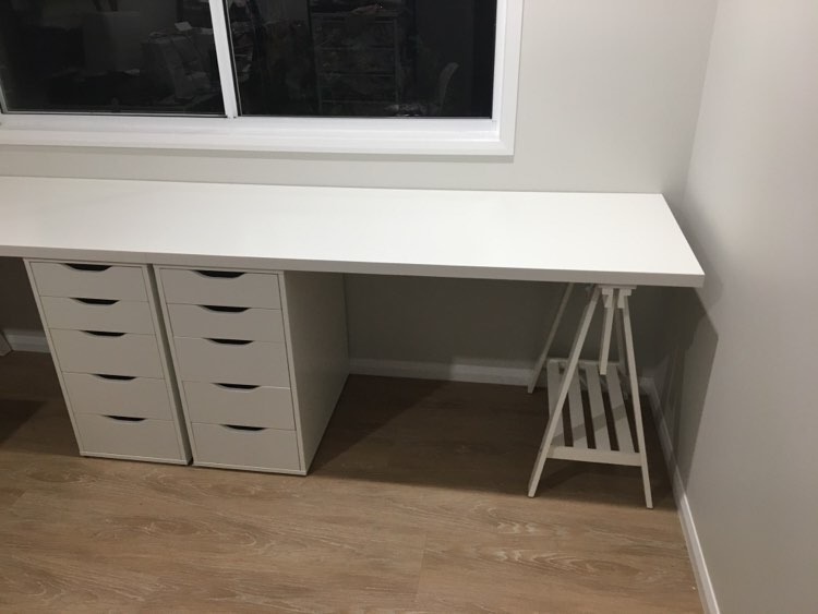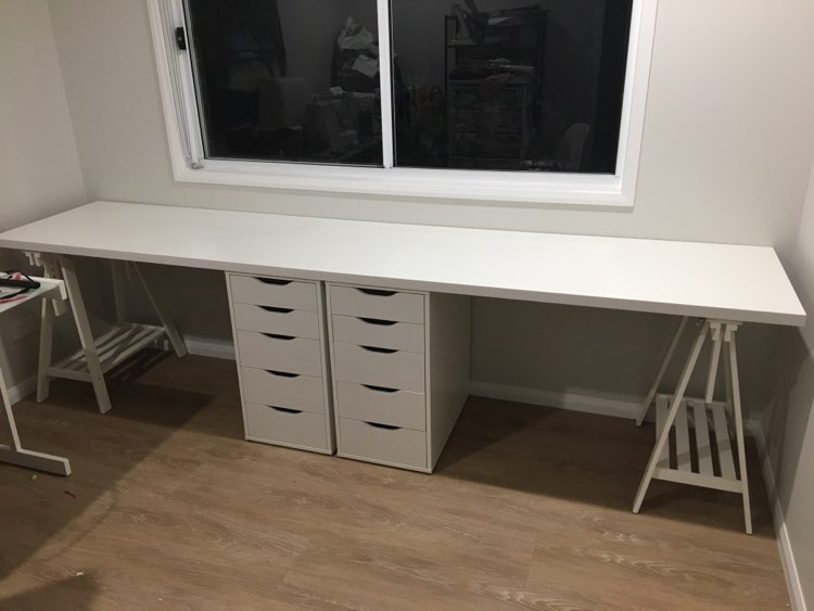 Now the pressure was on to create the ideal space and do it justice. Lots of Pinterest searching, dreaming, and researching, I finally decided on 2x IKEA desks, one for my computer and office space, and one for my sewing machine and overlocker. I drove the 1.5hr round trip to IKEA, toddler in tow, loaded up my trolley and car, then spent late nights when Ruby was asleep, assembling furniture, stubbornly refusing help from my husband. The result, one set of upside down drawers that needed to be redone, multiple blisters from using a screw driver so I didn’t wake Ruby with a drill, and finally a 3m wall of crisp white desk top and drawers! Worth it! For anyone interested, I made 2x desks from IKEA, each with a set of ALEX drawers, MITTBACK trellis leg and LAGKAPTAN desk top (1400mmx600mm).