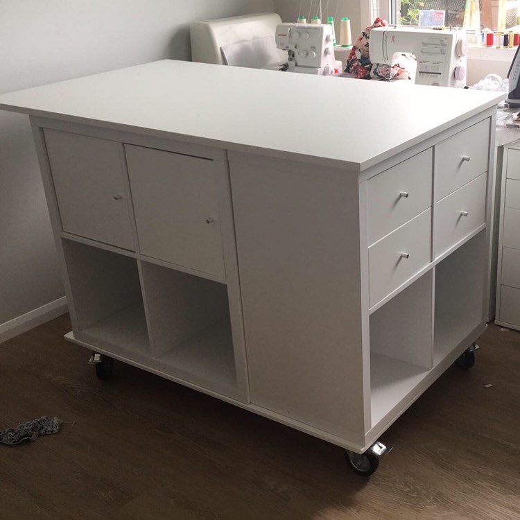 I wanted a craft table for my sewing room that was standing height for cutting out, a general workspace, and ideally a space kids could sit at stools and make creative mess in years to come. I wanted it as big as would fit, but once the desks were in, I realised I didn’t have as much room as I thought. After much deliberation, procrastination, and research (and a little nudge from my parents), I settled on a project. I have limited experience with this type of project but was keen for the challenge. I saw this picture on Pinterest and didn’t find the link to the tutorial until writing this post (face palm). I’m still much happier with the way I did it, it works for me. It was a classic reverse engineering project. After many phone calls for advice to my parents, and some more research. This is the final product. Disclaimer, I have no affiliation with any of the brands, just sharing what I’ve made!