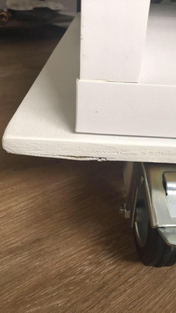 7. Attach castor wheels with hex screws on each corner, make sure they are close enough to the edge that the brakes can be reached with your foot. I drilled pilot holes for these. Each wheel had 4 screws, except one has only 3. The screws came in a pack of 15 and I didn’t want another pack just for one screw. I choose 100mm because of the height I wanted the finished table.
