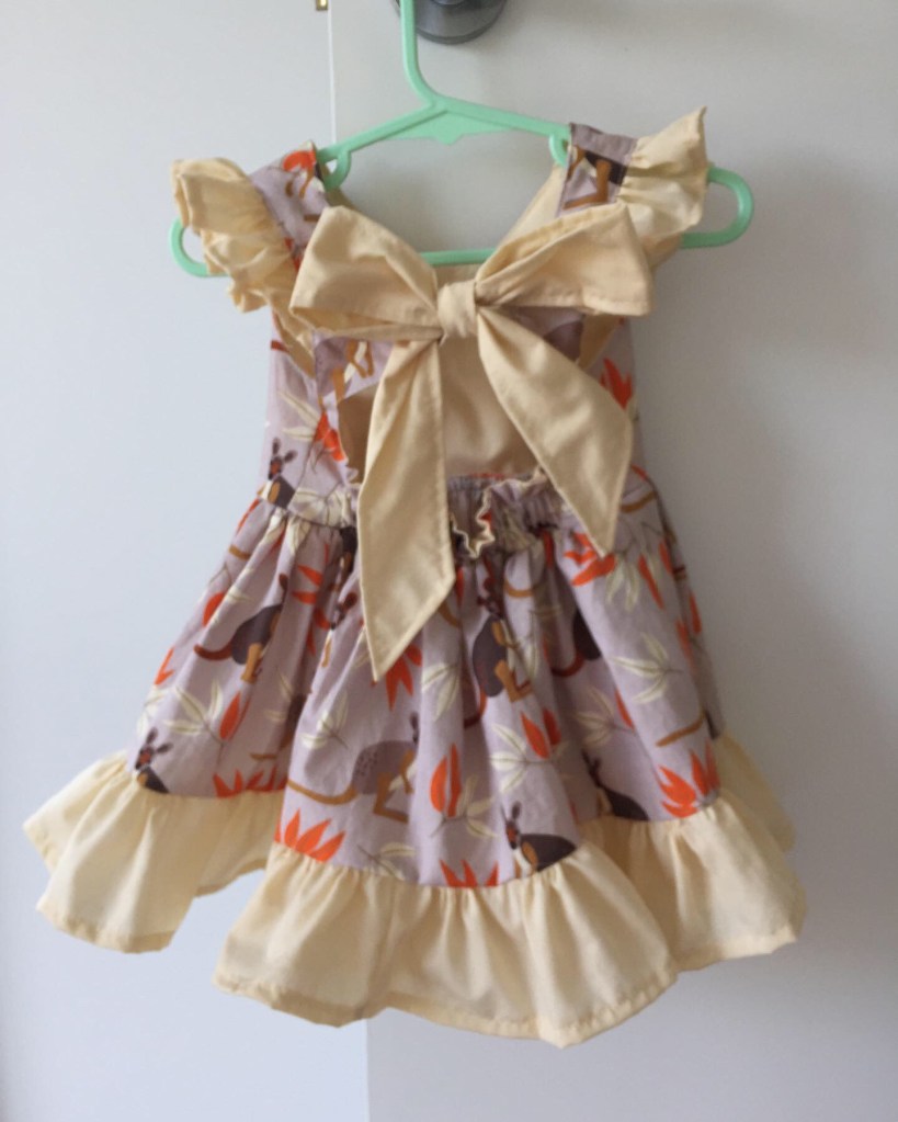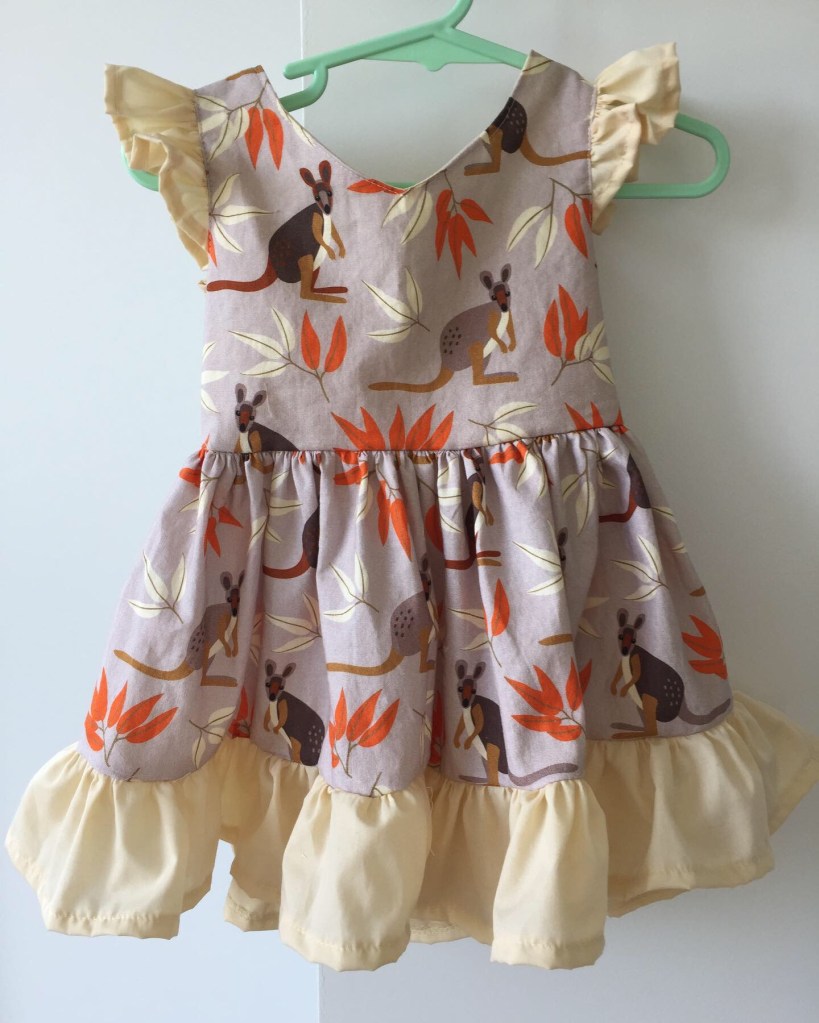 I decided to make a trial dress to test the pattern and sizing. I was going to use some cheap poplin but found this gorgeous wallaby fabric in the clearance rack from Spotlight for $6/m. I think I only used just over half a metre, since its directional fabric, and used a block colour for contrast. I’m so happy with how well it turned out considering it was just a trial. It’s a gorgeous dress, and the only outing Ruby has had in it, so many people commented on it!