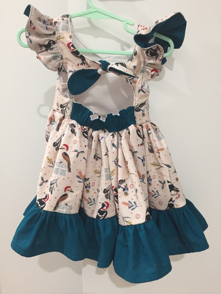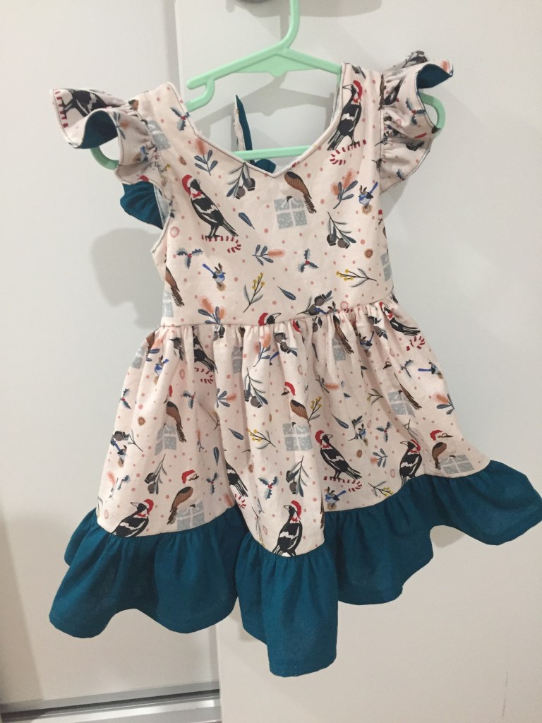 This one was a little adventure from the start. I washed the fabric first, with what I thought were like colours, but turns out there was red that ran. So what was a white background now is fainty pink, but actually quite nice, so not harm done! Next mistake, rushing, and cut all the bodice and flutter upside down while trying to be sneaky and make the most of the fabric, totally forgetting it was directional, opps. Ironically, while discovering this and recutting it, there is a kookaburra outside in the trees laughing. I also was meant to buy the contrast fabric in a poplin, which is quite light weight, but ended up with a broadcloth, which is much stiffer. The stiffness made gathering the flutter sleeve a little tough, but I got there! I lined the bodice in white, but used the teal broadcloth for contrast where it can be seen. I also choose to top stitch in the teal cotton for a little extra Christmas spirit. This dress was a labour of love, but it turned out so beautifully. I love it but am yet to be able to get it onto Ruby! Here’s a few pictures on it on the hanger for now because I just want to share it and move on.
