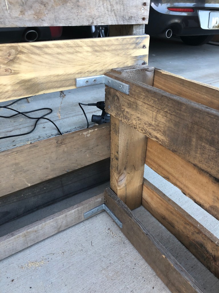The project overview: back pallet, roughly sanded, added some extra palings to fill in the gaps. Cut another pallet to make the legs – screwed on with L brackets. Roughly sanded the exposed sides. Made a bottom shelf from another smaller pallet – just cut it down and sat it on the legs. Made a bench/top from another pallet – dismantled one, and attached the palings closer together. It’s just sitting on top. Then I had to make a little platform/step because it was too high for her.